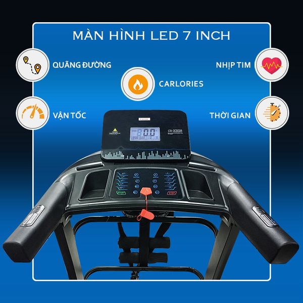 Màn hình LED 7 inch hiển thị đầy đủ mọi thông số vận tốc, thời gian, nhịp tim, quãng đường, calories giúp cho quá trình tập luyện của bạn được hoàn hảo hơn, bên cạnh đó còn được trang bị loa HIFI cực đại, với cổng kết nối jack 3.5 mm cho phép bạn vừa chạy bộ vừa thư giãn bằng như giai điệu âm nhạc yêu thích.